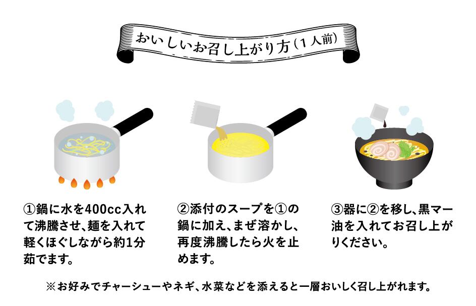 ※チャーシュー、ネギ、水菜、キクラゲなどをトッピングするとさらに美味しくいただけます。