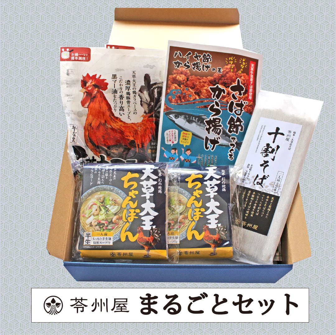 お家で天草の味を楽しめる、嬉しいまるごとセットの登場です!天草大王ラーメン、天草大王ちゃんぽん、ハイヤ節から揚げの素、十割そばがセットになっています。ここでしか味わえない本格的な天草の味を、ぜひお試しください!